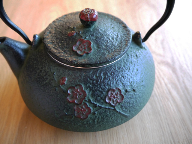 まるで苔庭のような深いグリーンと可憐な紅梅の花のコントラストが美しい南部鉄瓶急須です。